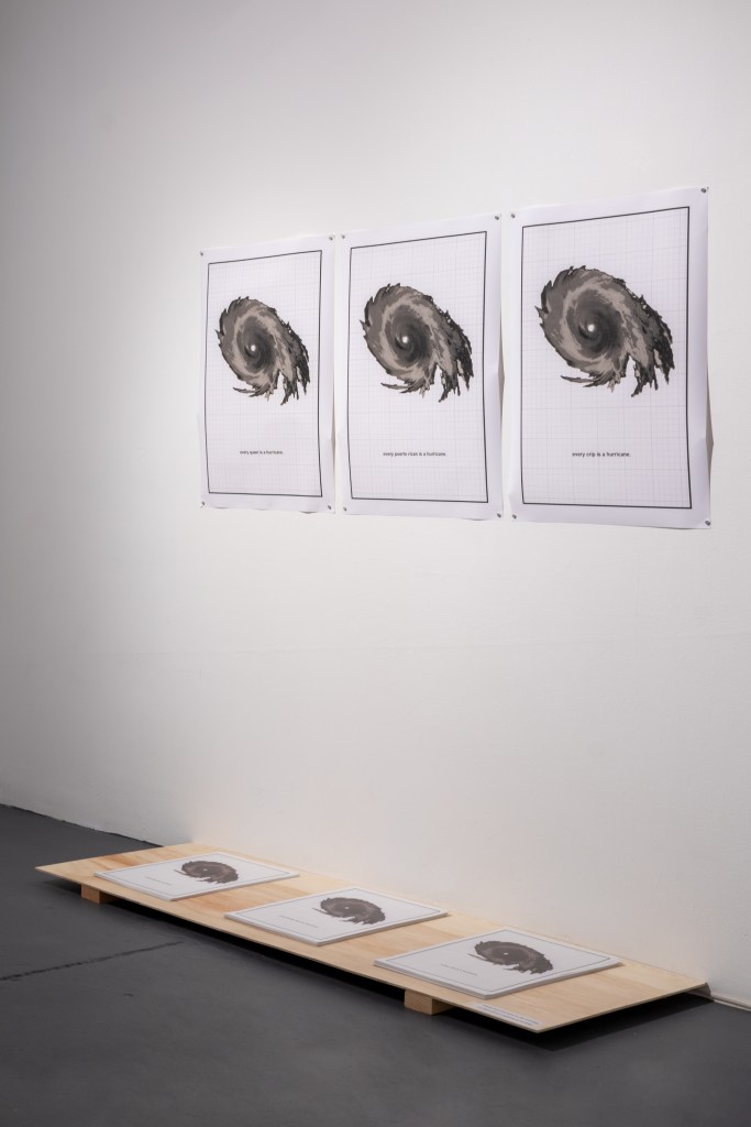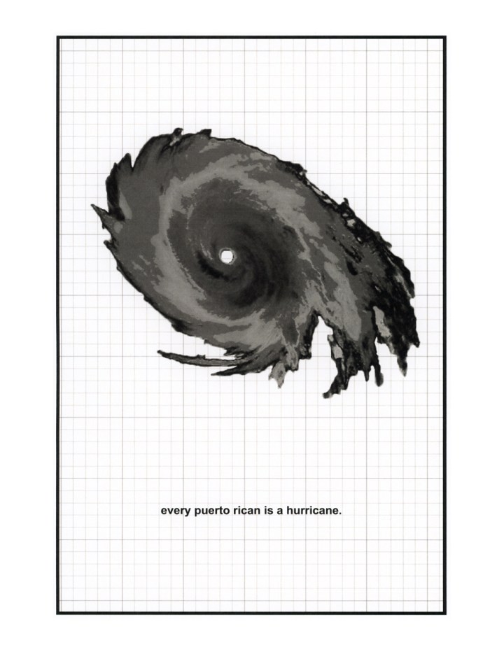 …is a hurricane is a series of protest signs, motivated by the countless signs created during the uprising in Puerto Rico in the summer of 2019. I reclaim the imagery of the hurricane, using a radar image of Hurricane María as it was passing over the island, and transform it into a representation of power, resistance, and revolt, not only to Puerto Ricans, but other marginalized communities I identify with, like the queer and disabled community.
