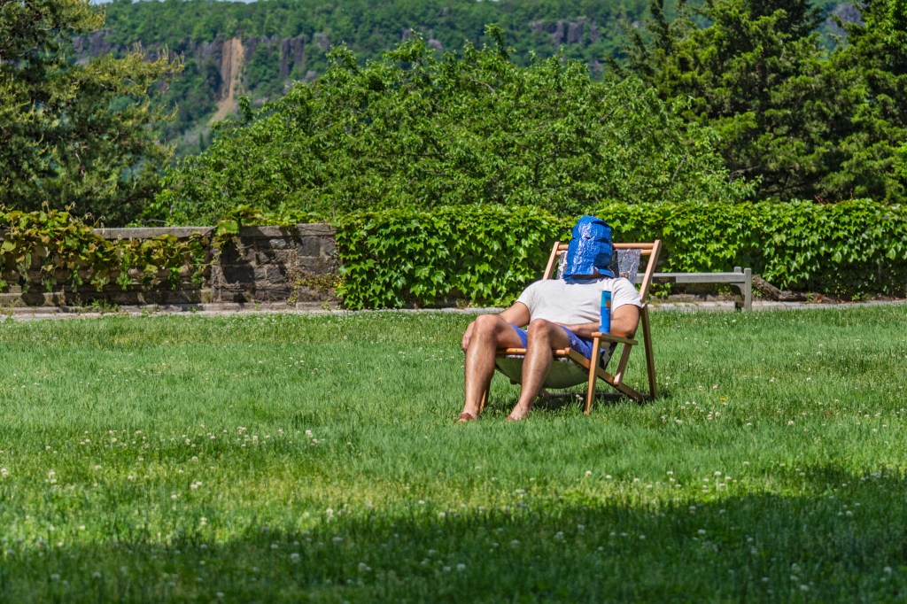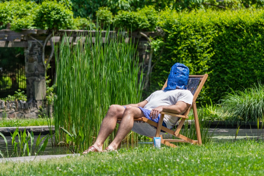 As part of the exhibition A tropic squall blew in, while you dried in the sand (2022), I activate the grounds of Wave Hill Public Garden & Cultural Center in Bronx, NY with a sun tanning performance, seeking to reclaim a leisure space. I wear a mask created out of a blue tarp, and I employ my body as a vessel to consider various facets of my identity in relation to human-made paradisiacal landscapes.